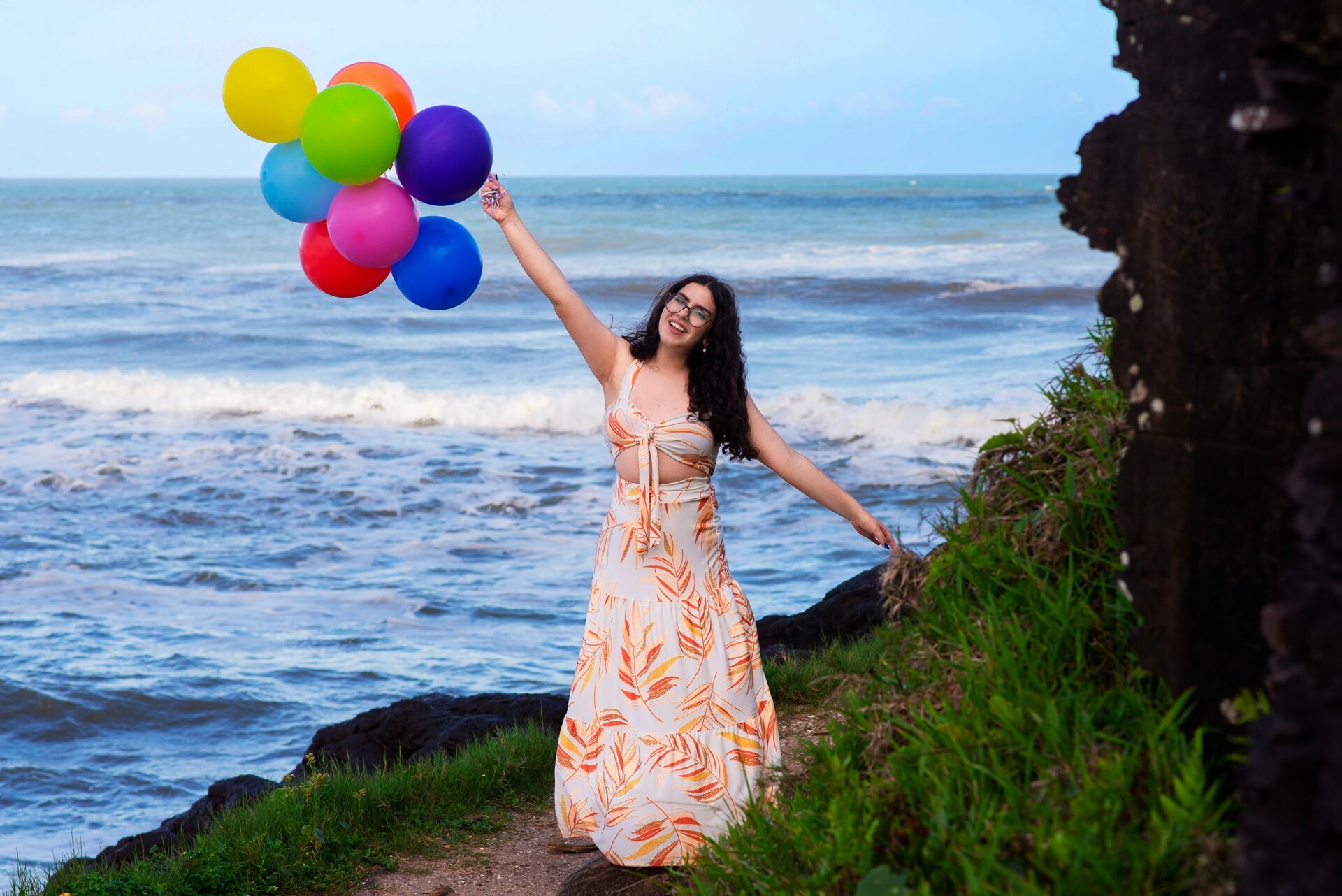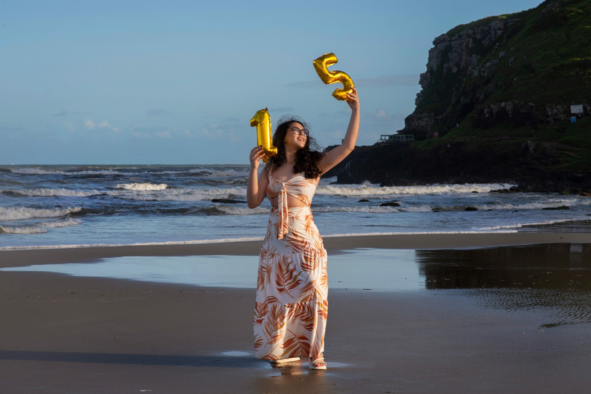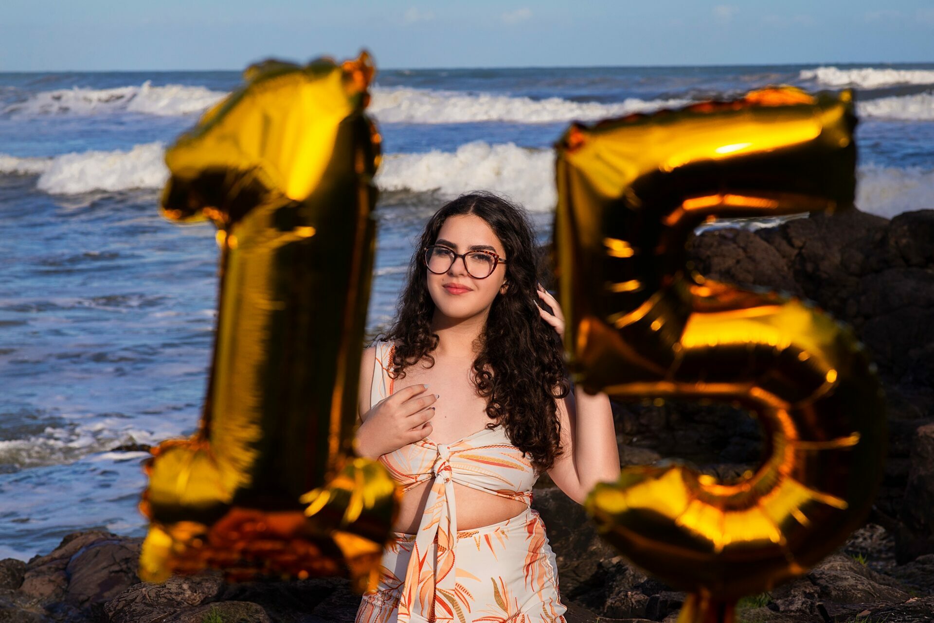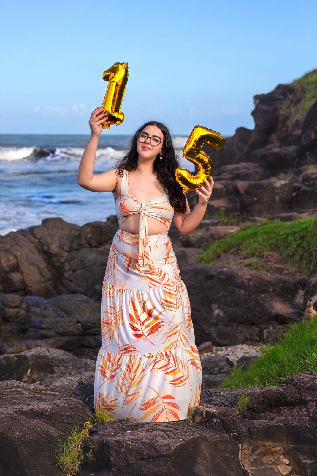 Sol, mar e falésias como plano de fundo de fotos de 15 anos.